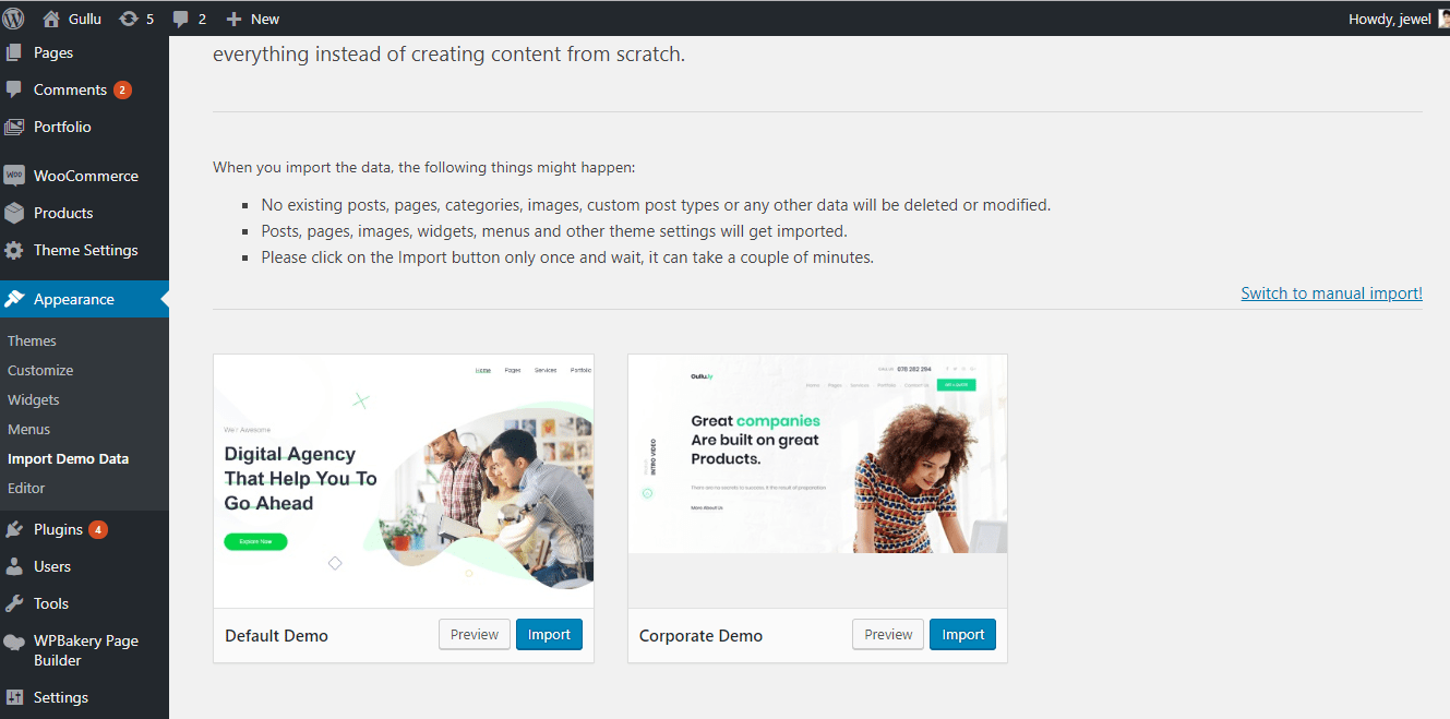If you failed to import the demo content by one click then you have to follow the below steps to import the demo content manually.  You will get all demo content data with the theme package. You will find the demos in ‘charles>inc/demo{disired-demo-number} this path.